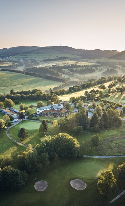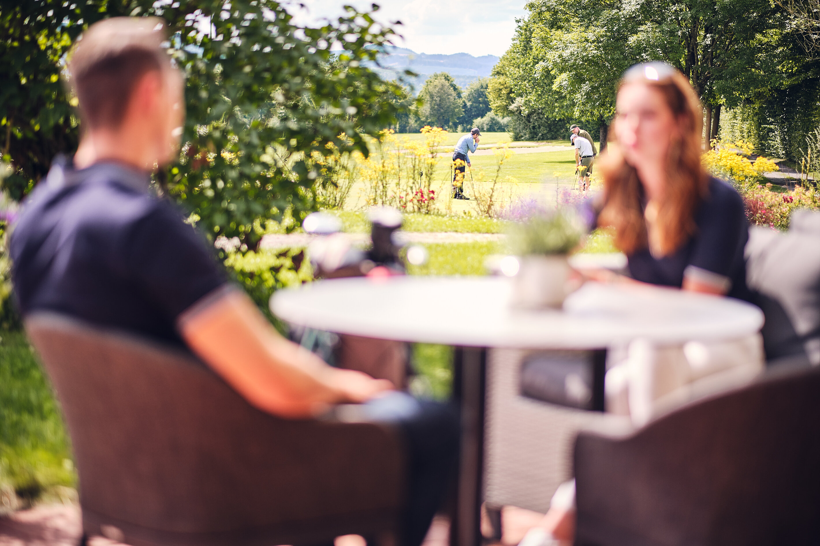 Ein besonderes Highlight des Café - Restaurant Sonnenhöhe ist die großzügige Panoramaterrasse mit Blick über den Golfplatz und die umliegende Landschaft.