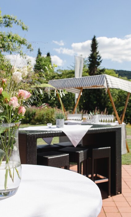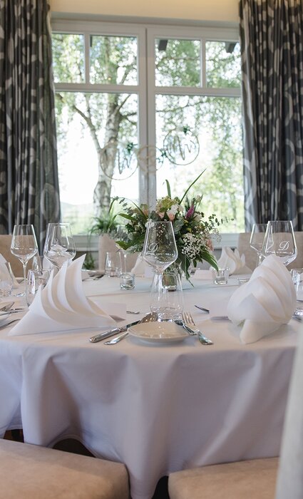 Empfangen Sie Ihre Gäste auf der Panoramaterrasse oder im Innenhof. Genießen Sie den Nachmittag bei Kaffee und Kuchen mit Panoramablick oder im Wintergarten. Am Abend laden unsere variablen Räumlichkeiten zu einem stilvollen Hochzeitsdinner an festlich gedeckten Tischen ein.